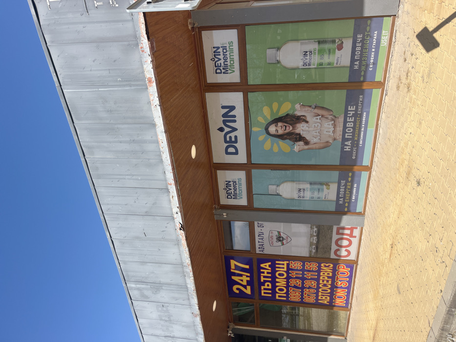 storefront with three large windows in Nova Zagora, Bulgaria, at the coordinates provided. The storefront has a gray corrugated metal roof and wooden trim. The windows are covered with large advertisements for Devin Mineral Vitamins. The leftmost window features a sign that reads "24/7" and "Пътна Помощ" with phone numbers and the text "Автосервиз" and "NON STOP". It also has a small emblem for the soccer team "Аватари - БГ". The center window depicts a woman raising her arms with the text "ТИ КАЗА ДА" and "НА ПОВЕЧЕ ФОКУС - ЖИЗНЕНОСТ - ЕНЕРГИЯ" and a tagline about vitamins in the body. The rightmost window advertises the "Devin Mineral Vitamins" with the text "НА ПОВЕЧЕ ЖИЗНЕНОСТ" and a tagline about coffee and guarana. The windows are recessed, with a visible sidewalk in front. There are yellow brick pavers on the sidewalk, partially obscured by shadows.