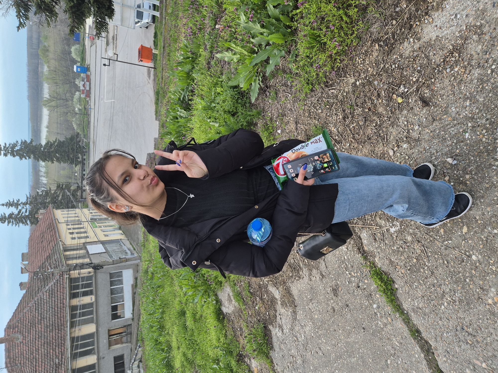 A young woman stands on a cracked concrete path beside a patch of green grass and vegetation in Tutrakan, Bulgaria. She is dressed in a black jacket, black sweater, and blue jeans. She wears black sneakers with white trim, a silver necklace, and an earring. She holds a pack of Double Max chips and a smartphone in her left hand and makes a peace sign with her right hand. A blue water bottle is visible inside her jacket. A black purse rests on the path next to her. Behind her, there is a building with a red tile roof and multiple windows. Beyond that, trees and a river are visible, with utility poles and temporary structures visible in the distance. The sky is overcast.