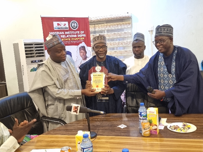 Four men are sitting around a wooden table in an office in Maiduguri, Nigeria (coordinates 11.832, 13.143). The man on the right is wearing a blue robe with a patterned vest and a white cap and is holding a plaque with one hand and a microphone with the other. The man to his left is wearing a white robe and a white cap and has his hand on the plaque. The man to his left is wearing a grey robe and a grey cap and is holding the plaque with one hand and his other hand is resting on his lap. The man on the far left is partially visible and is wearing a green and brown robe. There is a bottle of water, a can of malt, a box of milk, and a plate of candy on the table. A microphone with a "MR" logo is also on the table. In the background, a white air conditioner unit is visible on the wall. A banner with the text "Nigerian Institute of Public Relations (NIPRI) State Chapter" is also visible behind the men.