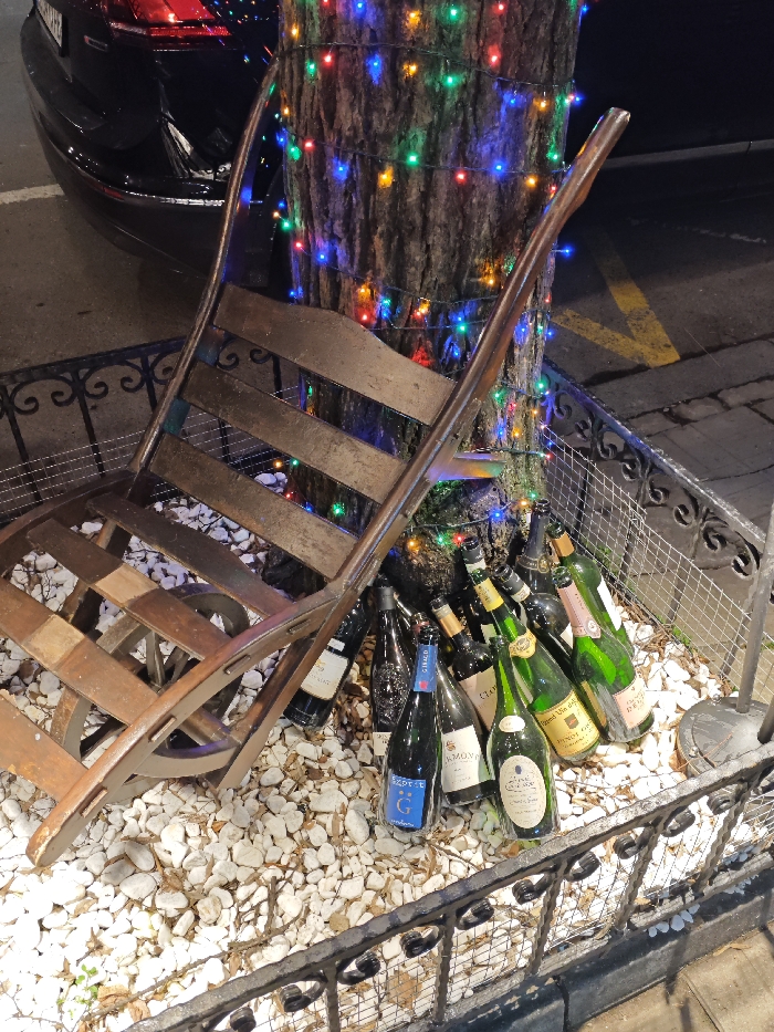 An outdoor scene in Sofia, Bulgaria, displays a large tree trunk illuminated by multi-colored string lights (red, green, blue, yellow) during nighttime or low-light conditions. Leaning diagonally against the tree, with its back facing the viewer, is a dark brown, slatted wooden chair. At the tree's base, approximately 15 to 20 empty wine and sparkling wine bottles are clustered, resting mostly upright or slightly tilted on a bed of white gravel mixed with scattered dry leaves. Bottle colors include green, brown, and clear, with various labels partially visible. The immediate area around the tree and bottles is partially enclosed by a dark metal fence featuring decorative scrollwork and a wire mesh infill. In the upper left background, the rear bumper and tire of a black parked vehicle are visible. To the right, dark pavement with a yellow painted line is present.