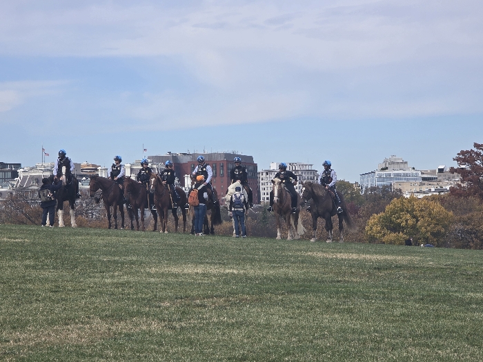 The image depicts an outdoor scene in Washington, D.C., likely captured from an elevated parkland area such as the National Mall or the Ellipse, looking towards federal buildings in the distance. The foreground consists of a broad, uneven expanse of green grass under natural daylight. In the midground, seven uniformed police officers are mounted on horseback, arranged in a loose line. The officers wear dark uniforms, protective vests, and distinctive blue helmets. The horses are predominantly brown or dark-coated, with one horse on the far left displaying white lower leg markings. Several civilians are present near the mounted officers: A person in dark clothing and a backpack stands near the leftmost horse. Two individuals in the central part of the group, one in a light jacket, are positioned close to a horse, with one appearing to interact with or observe its flank. Another civilian is visible to the right of this central group. Further in the background on the far right, a person is lying prone on the grass. The background reveals the urban skyline of Washington, D.C., characterized by various buildings. A prominent white federal building with multiple American flags flying from its roof, consistent with the Eisenhower Executive Office Building, is visible towards the left side of the frame. Patches of deciduous trees displaying autumn foliage in shades of yellow, orange, and brown are situated between the grassy midground and the distant cityscape. The sky is light blue with scattered thin white clouds, indicating clear weather conditions.