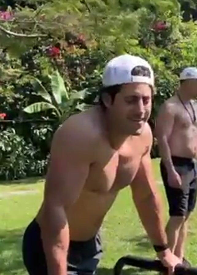 A shirtless man in a white cap is using parallel bars to work out on a sunny, grassy lawn. He's wearing gray running shoes and black shorts. Behind him, another shirtless man in a gray cap and black shorts is standing and watching. There are trees and flowering bushes surrounding the lawn, and a blue object that may be a pool is visible in the background. The first man looks up and speaks while gripping the bars.