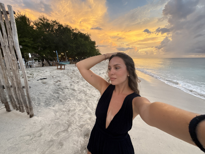 An adult female is depicted taking a selfie on a sandy beach in Unknown, Indonesia, at dusk