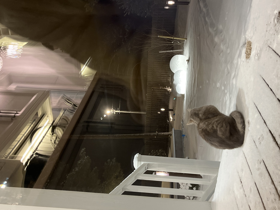 An indoor view through a window shows a winter scene. Snow covers the ground outside, where illuminated spheres provide light. A gray cat sits on a snow-covered deck, facing the snowy yard. Reflections of interior lights and architectural details are visible in the window. A white railing borders the deck. A distant street light illuminates bare tree branches.