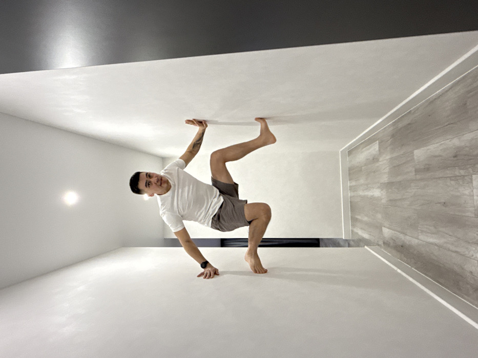 A rotated image shows a man appearing to "stand" on the ceiling of a room. He supports himself with one hand and foot against the ceiling. He wears a white t-shirt and gray shorts. The room has white walls and ceilings, with a section of grey, wood-like paneling on one side and a dark floor trim. A light fixture is visible on the wall. The picture is staged to create the illusion of gravity being reversed.
