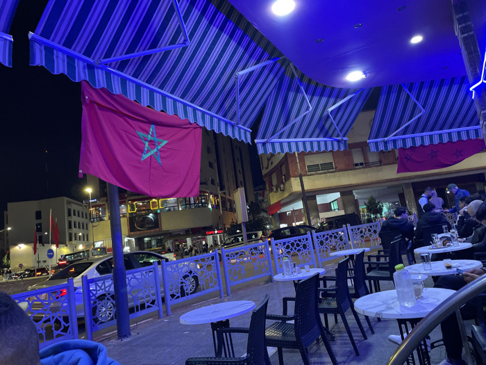 - "This nighttime urban scene depicts an outdoor cafe in Meknes, Morocco, characterized by a dominant blue artificial lighting scheme" by FM-AyvHa2, licensed under CC BY 4.0