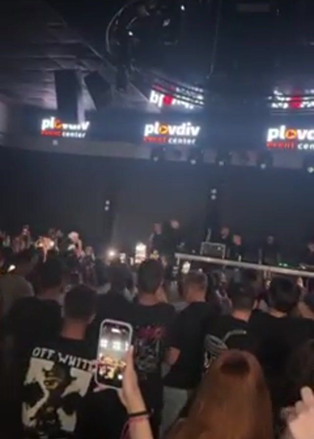 The video captures a crowded indoor concert, possibly at the Plovdiv Event Center, as indicated by the visible signage