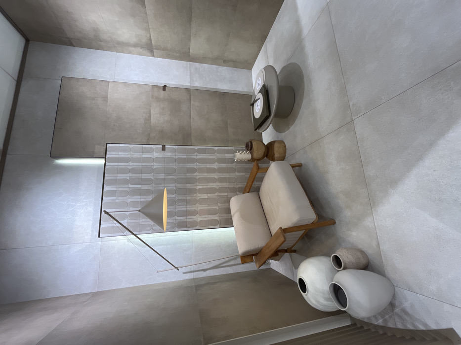 This image depicts an interior design display within what appears to be an exhibition booth or showroom, consistent with those found at trade fairs such as Cersaie in Bologna, Italy. The scene is devoid of people. The environment is defined by walls and a floor clad in large format ceramic tiles. The floor and the left wall feature light gray, subtly textured tiles with visible grid-patterned grout lines. The back wall comprises three distinct sections: the leftmost segment matches the light gray tile, the central segment is a vertical panel with a repeating light and dark gray elongated U-shaped pattern, and the rightmost segment, along with the entire right wall, is clad in horizontal panels of darker taupe-brown tiles. A narrow, vertical strip light emits a bright luminescence along the left side of the patterned central back panel. In the left foreground, three decorative vases are arranged on the floor: two large, smooth, off-white, ovoid-shaped vases with dark interiors, and one smaller, textured beige vase. A light beige upholstered armchair with wooden armrests and frame is positioned centrally, facing slightly towards the right. Above the armchair, a modern floor lamp with a long, slender arm and a conical shade illuminates the area with a warm yellow glow. To the right of the armchair, a small, irregularly shaped wooden side table holds a decorative white ceramic multi-cylinder object and a small dark brown object. In front of the armchair, a low, round, light gray coffee table displays two flat, disc-like objects resembling records or coasters—one dark gray, one light gray—both marked with white circular labels. A small, dark cylindrical object also rests on the coffee table. The overall aesthetic is contemporary and minimalist, showcasing various tile textures and colors alongside modern furnishings.