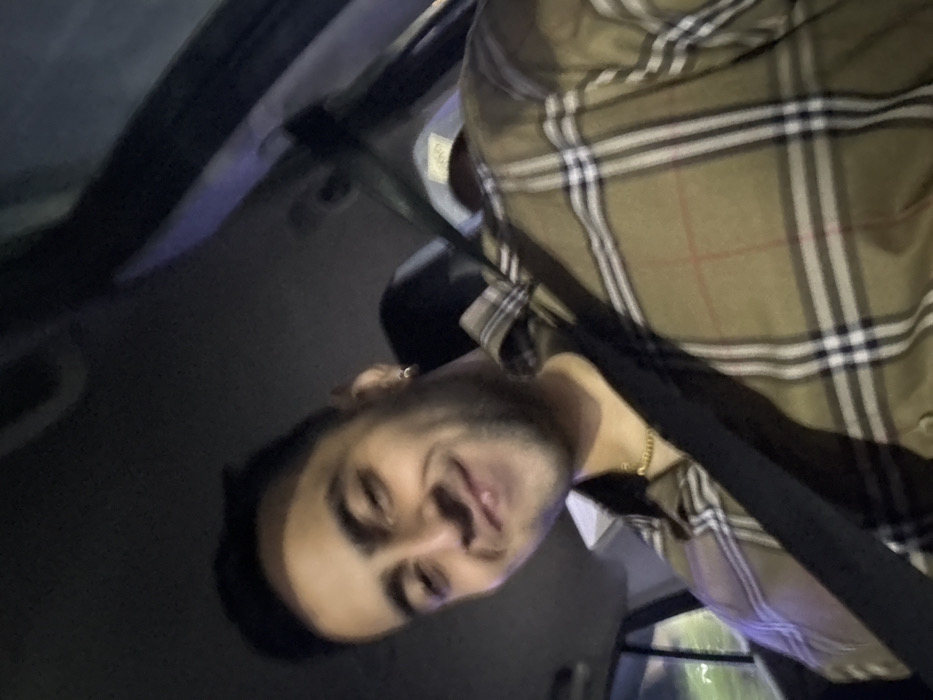 The image depicts a male individual inside a vehicle, likely a car, during nighttime or in a dimly lit environment