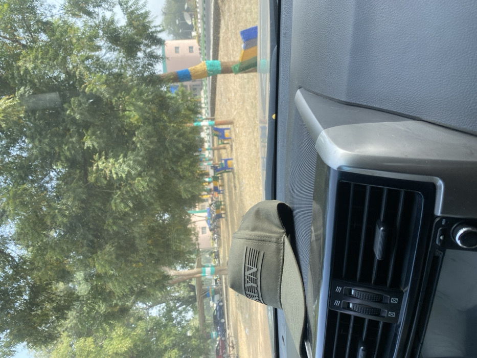 The image depicts an outdoor scene in Yan Dala, Nigeria, viewed from the interior of a vehicle. In the immediate foreground, an olive-green baseball cap featuring a black rectangular patch with the text "ALYN" and horizontal line detailing is positioned on a dark gray, textured vehicle dashboard. Below the cap, central air conditioning vents and a portion of the vehicle's audio system with a control knob are visible. Beyond the windshield, a park-like area is observed under clear daylight. Numerous trees with dense green foliage are present, several of which have their trunks painted with horizontal bands of vibrant colors, including green, blue, yellow, and orange. Scattered across the dry, light-colored ground are multiple brightly colored plastic chairs, primarily blue and yellow, some accompanied by small tables, indicating an outdoor seating arrangement. To the left, under a shaded structure, several parked vehicles, including cars and motorcycles, are visible. In the background, a multi-story building with light pink or peach-colored walls and horizontal window bands stands prominently. A paved road or pathway with a curb is discernible curving towards the right in the mid-distance. No individuals are visible in the scene.