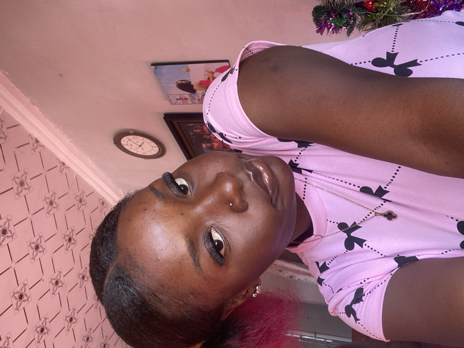 An indoor scene in Rido, Nigeria, depicts a young adult female subject centered in the frame. The individual has dark skin, dark hair with a visible pink section on her left side, extended eyelashes, a silver nose stud on her right nostril, and a silver stud earring on her left ear. She is wearing a light pink, short-sleeved top adorned with a repeating black bow and dotted line pattern, along with a thin gold-colored necklace featuring a dark four-leaf clover pendant. Her right arm is raised, partially obscuring her torso. She looks directly at the viewer with a slight head tilt. The background consists of a light pink wall and a pink ceiling patterned with intersecting lines and star-like motifs. White crown molding runs along the wall-ceiling junction. On the wall to the subject's upper right, a circular analog clock with Roman numerals and a dark frame displays a time around 2:00. Below the clock, a dark-framed picture is partially visible, and further right, a vertically oriented framed picture displays an individual in a pink dress. A segment of a decorative item, consistent with a Christmas tree or garland featuring purple and green tinsel, is visible in the lower right corner.