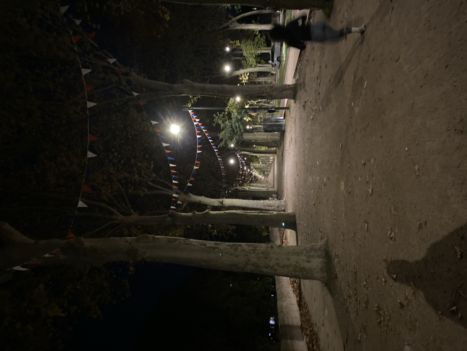 The image displays a nighttime scene on a tree-lined urban promenade, identified as the Allées Frédéric-Mistral or a similar promenade along the Canal du Midi in Toulouse, France. The foreground presents an unpaved dirt path scattered with fallen leaves. A prominent, elongated human shadow, indicating the photographer's position, extends from the lower left towards the center. To the left, a low, light-colored stone wall borders the path, disappearing into darkness beyond. The promenade is lined with tall, bare or sparsely foliated deciduous trees, which define a long avenue extending into the background. Multiple strands of triangular bunting, featuring red, white, and blue colors, are strung horizontally between the trees overhead, stretching the entire visible length of the promenade. Numerous streetlights illuminate the path, casting bright glows and long shadows from the trees and individuals. On the right side of the path, a person is depicted in motion, jogging or running away from the camera. This individual wears a dark long-sleeved top and light-colored trousers or leggings. Further down the path on the right, two indistinct figures are visible standing near a streetlight, adjacent to a dark, upright waste bin. Beyond the right-most row of trees, a paved area with a parked white vehicle is discernible in the distance. The overall environment is illuminated primarily by artificial light sources.