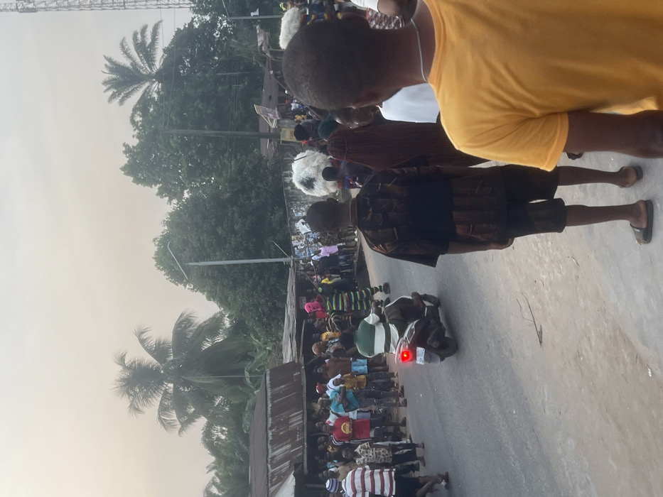 A cultural street procession unfolds with a crowd lining the sides of a road