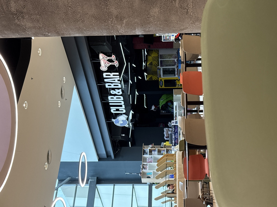 The image displays an interior view within Mall Galleria Burgas, located at ul. "Yanko Komitov" 6, 8000 Burgas, Bulgaria. The central focus is a "CLUB & BAR" establishment situated in the background, identified by its illuminated white signage featuring the text "CLUB & BAR" with a bowling pin icon on the left and two cocktail glasses on the right. This area is characterized by dark wall paneling and contains multiple arcade games, including a large green frog-shaped structure and a yellow arcade cabinet. A "RECEPTION" counter with a white desk is visible in front of shelving units within the club's entrance. The foreground and mid-ground feature a brightly lit common area, likely a food court or lounge. The high ceiling is fitted with recessed downlights and large circular LED ring lights. A significant glass facade with dark framing is present on the left, contributing to the bright ambient light. A large, textured pillar, appearing to be concrete or stone, occupies the right side of the frame. The seating arrangements consist of numerous dining tables with dark tops and metal bases, surrounded by chairs in burnt orange, light beige, and dark brown. A section of booth seating with distinctive light wood-colored vertical fins is also visible. A large, curved, light-green upholstered seating element partially obscures the lower foreground. One female individual, wearing glasses, is partially visible seated at a booth table on the far left. No specific actions or interactions are discernible beyond her seated posture.