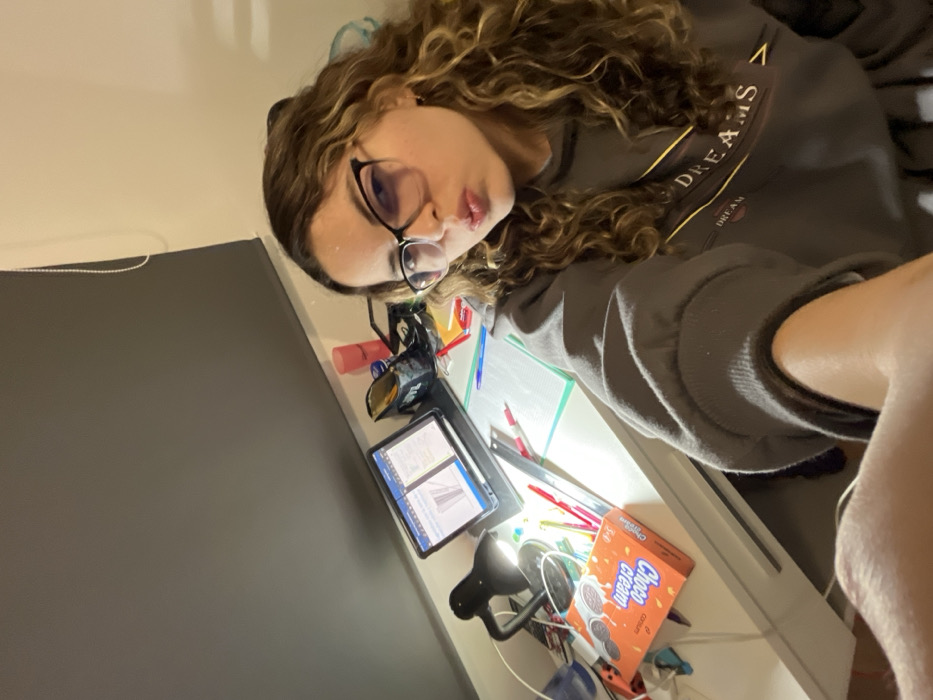 A curly-haired person with glasses is lying down near a cluttered desk. The desk contains a tablet displaying charts, a lamp, various pens, a notebook, and a box of "Choco Cream" cookies. The person is wearing a grey sweatshirt with the word "DREAMS" printed on it in tan. The background includes a plain wall.