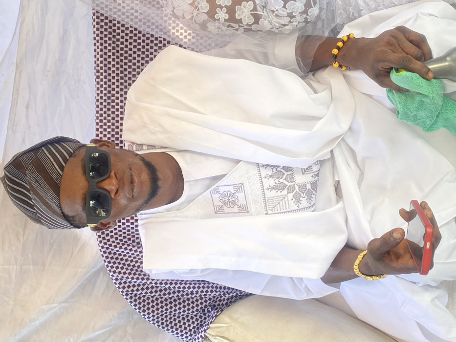The image depicts a seated adult male and a partially visible individual in Ajaokuta, Nigeria, likely at a formal or semi-formal event