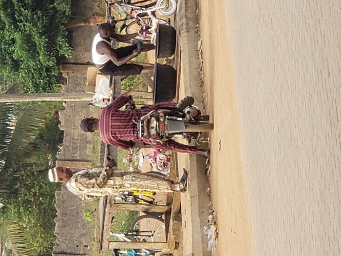 Three men are pictured by the roadside. One in a white tank top crouches by a black basin near bicycles. A man on a parked motorcycle wears a red and purple striped shirt and pants. An older man in patterned robes and a white cap stands facing the camera. The road fills the right side of the image. Buildings and lush foliage line the opposite side.