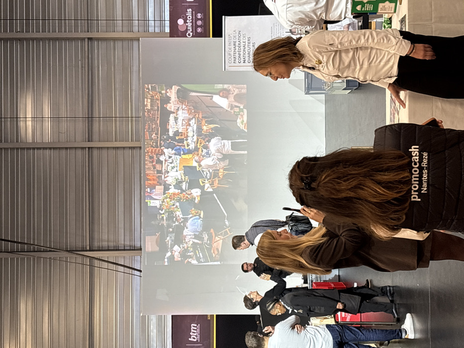 The image captures an indoor event, likely an exhibition or trade show, within a large hall characterized by industrial architecture including corrugated metal walls and exposed support beams. The presence of a black puffer vest displaying "promocash Nantes-Rezé" confirms the location is in or near Nantes, France. A prominent feature is a large rectangular projection screen positioned centrally, displaying a wide-angle image of a bustling indoor banquet or reception with numerous people, round and rectangular tables, and decorative elements. In the foreground, an individual with brown, wavy hair and a black claw clip is seen from behind, wearing a black puffer vest with "promocash Nantes-Rezé" in white lettering. To their left, a woman with long blonde hair, dressed in a dark brown blazer, holds a black smartphone horizontally, appearing to photograph or record. To the right, a woman with shoulder-length brown hair and glasses, wearing a white chef's jacket with an embroidered emblem, stands behind a white display table. She is actively conversing and gesturing with her right hand towards the person in the Promocash vest. Adjacent to her is a white vertical banner inscribed with "COUP DE PATES® PARTENAIRE DE LA CONFÉDÉRATION NATIONALE DES CHARCUTIERS." On the left side of the frame, a group of people is visible, including a man in a light blue shirt, a woman with short dark hair and glasses, and a Black woman in a dark uniform holding a red object. Other individuals are partially obscured further back. In the background, a black banner with "btm BAR & TABLE MODERN'HOTEL" is visible on the far left, and a white banner with "Quiétalis" and a pink circular logo is on the far right. The floor is dark and reflective, and the scene is uniformly lit by artificial overhead lighting.