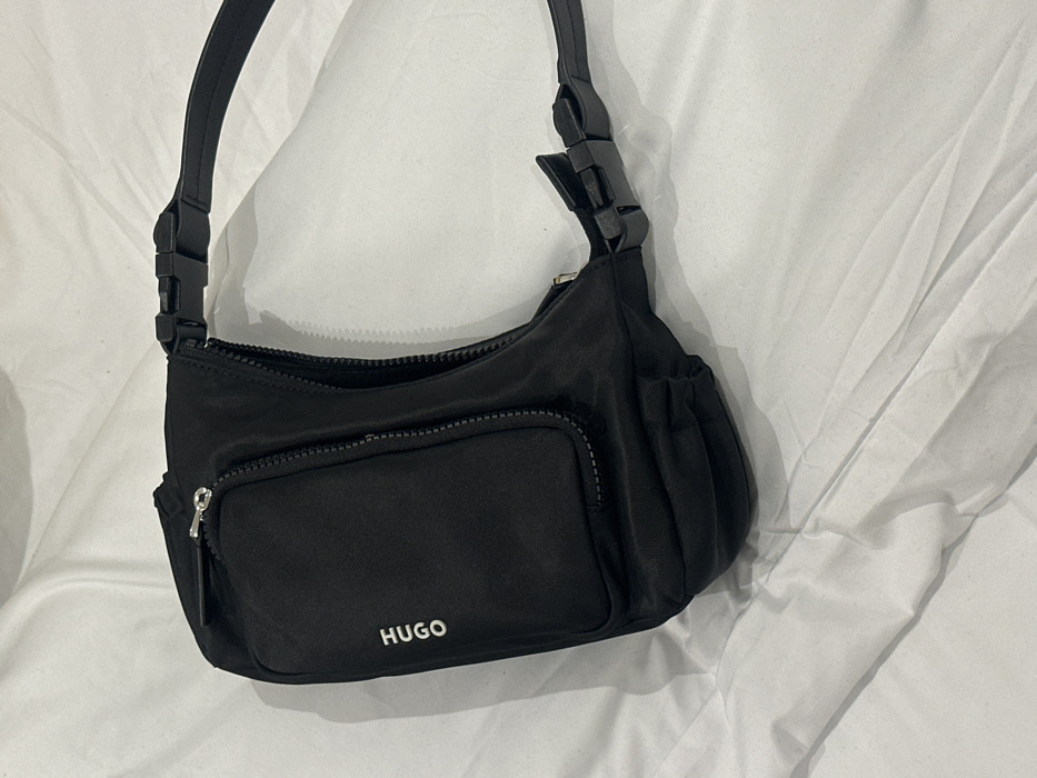 - "A black synthetic textile shoulder bag, featuring a white vertical "HUGO" logo on its zippered front pocket, lies diagonally on a white, rumpled fabric surface" by FM-Ohpnb2, licensed under CC BY 4.0