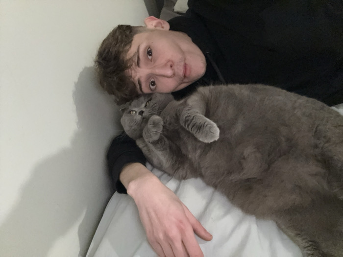 - "A young man with short brown hair, wearing a black hooded sweatshirt, lies on a bed next to a plump, grey Scottish Fold cat" by FM-H2ZHJ3, licensed under CC BY 4.0