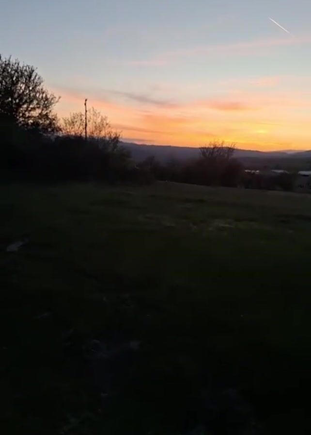landscape at dusk or dawn, featuring a grassy field in the foreground. The field is mostly dark due to the low light. A line of trees is visible on the left, also silhouetted against the sky. In the distance, there are hills and what appears to be a small settlement. The sky is the primary focus, displaying a colorful sunset or sunrise with shades of orange, pink, and blue. A white contrail is visible across the upper part of the sky. The camera is static throughout the video. There is speech in the background.