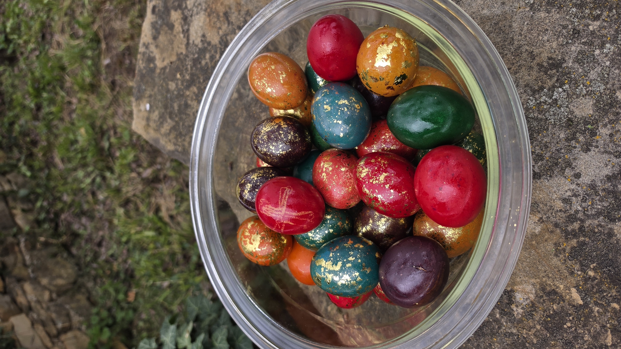 - "A high-angle, eye-level shot displays a clear glass bowl filled with numerous decorated eggs" by FM-vkdJ33, licensed under CC BY 4.0