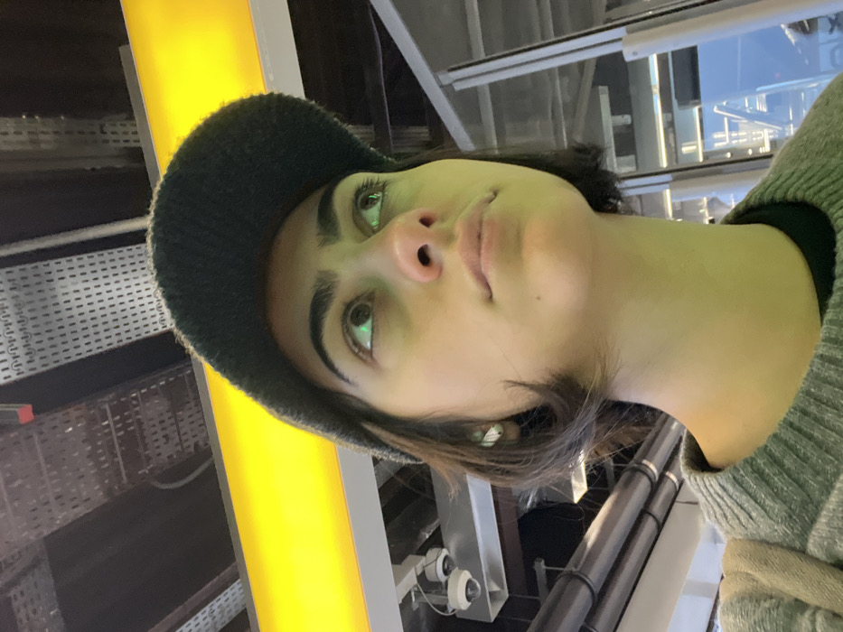 The image depicts an individual within an interior setting identified as Paris-Orly Airport in Paray-Vieille-Poste, France. The subject is a person with short, dark hair, wearing a dark grey knit cap, a light grey ribbed sweater, and a dark shirt underneath. A white earbud is visible in the subject's left ear, and a light-colored strap, possibly from a bag, rests on the right shoulder. The subject's gaze is directed upwards and slightly to the right, with a neutral facial expression. The overhead environment includes an exposed industrial-style ceiling featuring dark structural elements and multiple perforated silver-colored cable trays. A prominent, rectangular, bright yellow light fixture extends horizontally across the upper mid-ground, casting a strong yellowish-green illumination on the subject. To the upper left, a cluster of three white dome-shaped security cameras is mounted. Below these cameras, dark cylindrical pipes or ducts are visible. On the far right, a vertical white structural column and a portion of a large glass partition or window are present, reflecting interior light sources.