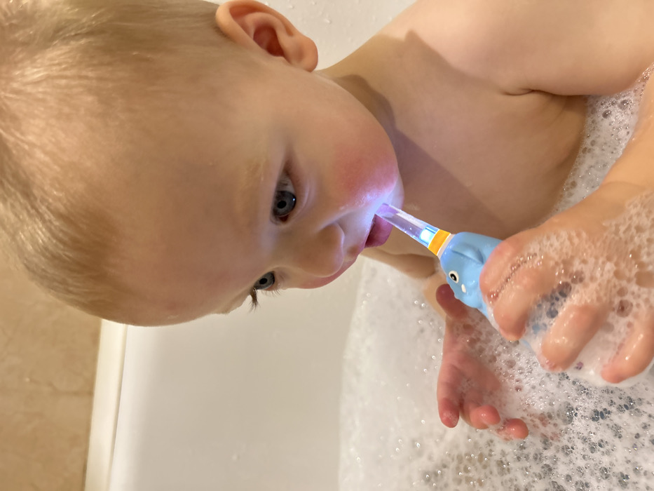 - "A young child with fair skin and blonde hair is in a bubble bath, holding a blue and yellow light-up toothbrush" by FM-kJsX23, licensed under CC BY 4.0