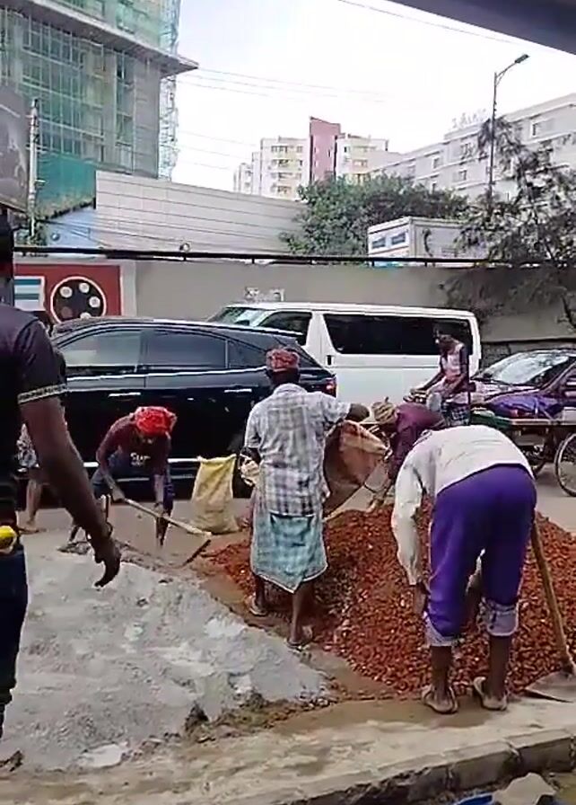 group of construction workers on a city street. They are working with sand, gravel, and bags of materials. One worker is digging with a shovel, while others are loading material into bags and onto a bicycle-pulled cart. There are cars and a white van driving by in the background. A tall building is partially visible in the background.