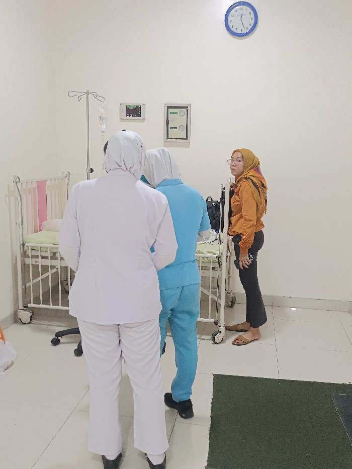 An indoor medical room in Margorejo, Indonesia, is observed. The room features white walls, a light-colored tiled floor, and a dark green mat section in the lower right. A blue-rimmed wall clock, indicating approximately 12:50, is mounted high on the wall. Two framed items are fixed to the wall: a digital display on the left and a document or chart with two circular gauges on the right. A white metal crib or child's bed with a light green mattress and pink-striped bedding is positioned on the left side of the frame. An IV pole with a clear fluid bag hangs immediately adjacent to the crib. Three adult females are present. In the foreground, a woman wearing white medical scrubs and a white hijab stands with her back mostly to the camera. Directly in front of her, a second woman in light blue medical scrubs and a light blue hijab is also viewed from the back, positioned closer to the crib. A third woman, dressed in an orange long-sleeved top, dark pants, and a multi-colored hijab, stands on the right side of the crib, facing left towards the other two individuals and the crib. She wears open-toed sandals and is holding onto a component of the crib or an adjacent piece of medical equipment. A dark bag is suspended from the crib railing near her. The two individuals in medical attire appear to be focused on the crib area, while the third woman observes the scene.