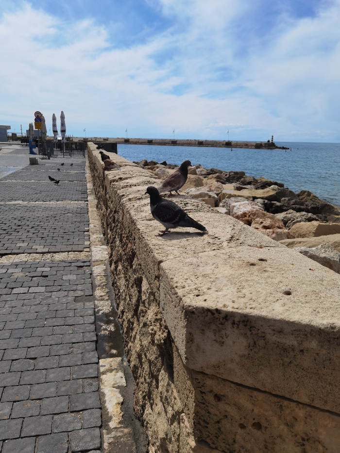 The image depicts a daytime scene at Jaffa Port in Tel Aviv-Yafo, Israel, under a partly cloudy sky. The foreground is dominated by a weathered, light-colored stone retaining wall running diagonally from the lower left towards the upper right. Three pigeons are perched on this wall: a dark grey pigeon in the immediate foreground, a brown and grey pigeon further back, and another dark pigeon partially visible. To the left of the wall, a paved promenade composed of dark grey and lighter grey rectangular blocks extends into the midground. Several additional pigeons are visible on this paved surface near a cluster of closed, light-colored umbrellas and a pole with signs, including a circular red and white traffic sign. Beyond the stone wall, a rugged stretch of natural rock forms a shoreline leading into the calm, blue waters of the Mediterranean Sea. In the midground, a concrete pier or breakwater extends into the sea, marked by several small, white structures along its length. At the distant end of this pier, a distinctive black and white striped lighthouse is prominently visible. The sky is bright blue with scattered white cumulus clouds. No human figures are present.