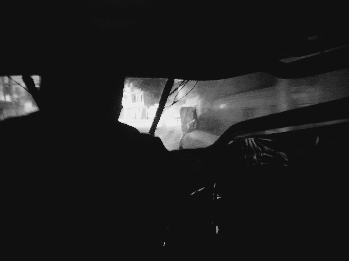 From inside a vehicle, possibly a tuk-tuk or similar three-wheeled transport, a dark figure drives. Outside, hazy streetlights illuminate buildings and a blurred road. A side mirror is visible on the left. The vehicle's canopy or frame curves above, partially obscuring the view. The image is predominantly black and white with low visibility.
