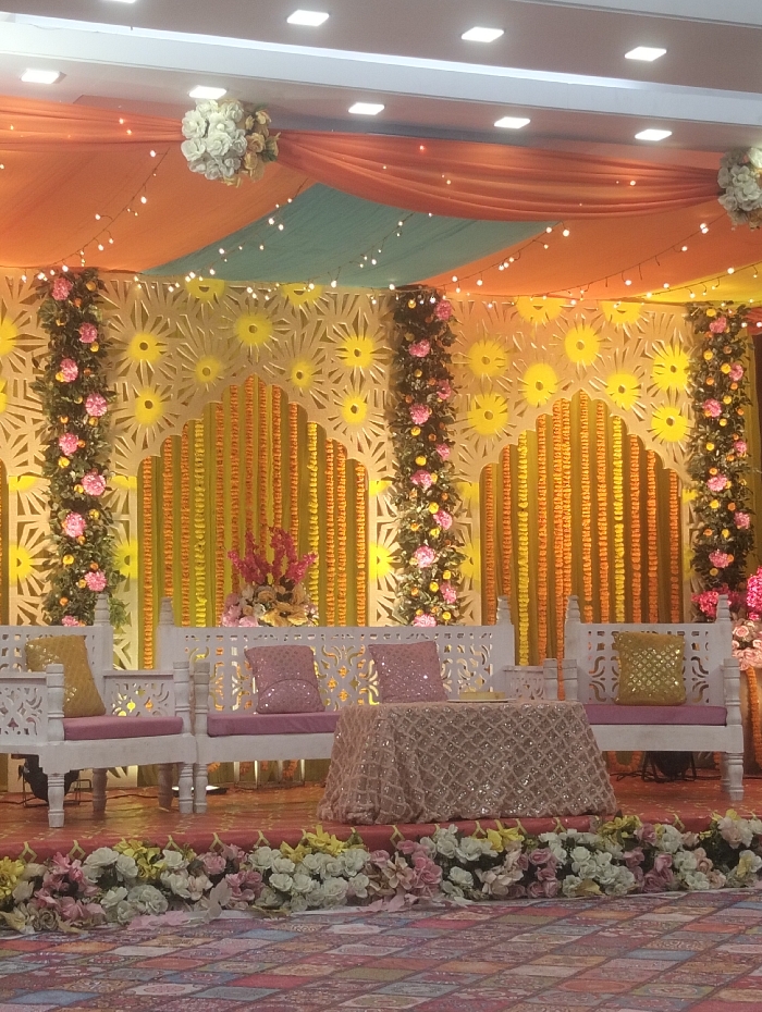 The scene depicts an elaborately decorated indoor event space, likely a stage or seating area for a celebration. The specific location within Dhaka, Bangladesh, cannot be determined from the visual evidence provided. The environment features a backdrop with multiple layers. The innermost layer consists of vertical strips of yellow-orange garlands. Overlaid on this are light-colored decorative panels with sunburst or floral cutout patterns, forming arched sections. Integrated into the backdrop are vertical columns adorned with extensive floral arrangements predominantly in pink and yellow hues with green foliage. The ceiling is draped with alternating sections of orange and teal fabric, from which string lights with small bulbs are suspended. Several white artificial floral clusters are also suspended from the ceiling. The ceiling itself is white with square recessed lighting fixtures. In the foreground, a raised platform or stage is present, bordered by a continuous line of light-colored artificial flowers in white, pink, and pale yellow. On this platform, three white wooden benches with intricately carved details are arranged. The benches have light pink seat cushions. The two benches on the left are positioned adjacent to each other, with a gold sequined pillow on the left bench and two pink sequined pillows on the middle bench. A small table, covered with a light pink sequined tablecloth, is positioned in front of the middle bench. A third white wooden bench, also with a light pink cushion and a gold sequined pillow, is situated to the right. No individuals are visible, and no actions or interactions are depicted. The floor in the immediate foreground is covered with a patterned rug featuring geometric designs in red, orange, and blue tones.