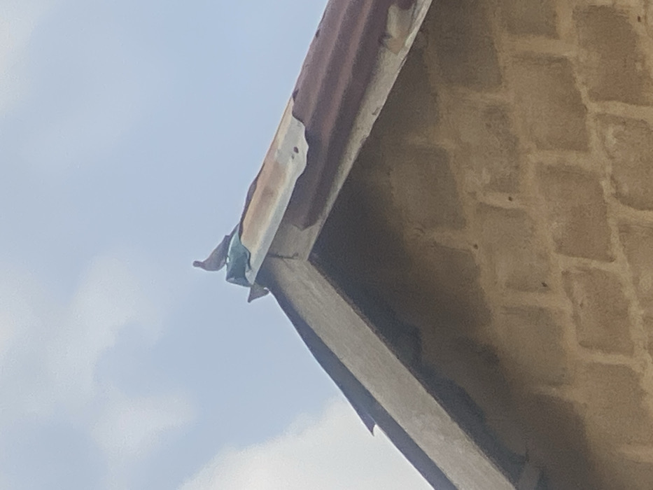 A single bird, appearing to be a dove or pigeon with brownish-grey plumage, is perched atop the apex of a building's gable roof in Idiroko, Nigeria. The bird is oriented facing left, with its head slightly raised. The roof consists of corrugated metal sheets; the upper visible sheet exhibits significant rust, presenting a reddish-brown and silver-grey coloration. Beneath this, a segment of a greenish-blue corrugated sheet is visible near the ridge. The roof structure below the sheets includes light grey rafter ends or fascia boards. A section of the building's wall, constructed from light brown or tan-colored concrete blocks with visible mortar lines, is present in the lower portion of the frame. The background features a light blue sky with indistinct white cloud formations.