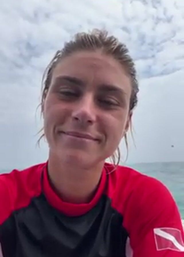 woman in a red and black wetsuit sitting on a boat, facing the camera with a slight smile. Her wet hair is pulled back, and she rests her chin on her hand. The ocean and a cloudy sky are visible in the background. The wetsuit has "mares" printed on the front and a diving flag on the sleeve. The boat appears to be moving.