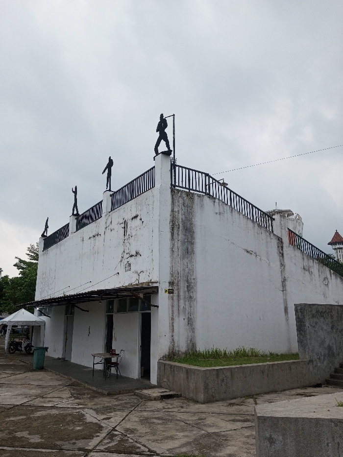 A white, rectangular building with weathered, stained walls stands under an overcast sky in Cianjur, Indonesia. The building features a flat rooftop with a black metal railing. Mounted atop the roof are at least five black silhouette figures, appearing to be human forms in various poses; one figure is positioned on a corner, grasping a vertical bar. Below the rooftop, the white walls exhibit cracks and vertical dark streaks. On the ground level to the left, a section of the building has an attached metal awning. An open doorway reveals a dark interior. A small, dark table with two chairs is placed outside this entrance. Adjacent to the building on the left, a white canopy tent is erected, and a green trash receptacle is visible next to it, with a white scooter parked nearby. The ground surface in the foreground is a stained, cracked concrete patio. A low, concrete planter box filled with grass is situated to the right of the building's ground-level facade. In the background, to the far right, a structure with a reddish-brown, tiled roof is partially visible.