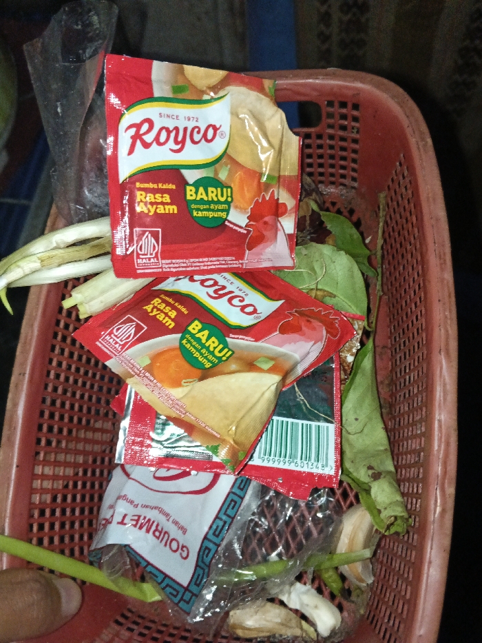 A red plastic basket contains food scraps and packaging. Two red and white Royco chicken bouillon packets are prominently displayed, one on top of the other, both advertising "New! With kampung chicken". A Gourmet seasoning packet is also visible amidst green leaves, vegetable stems, and garlic cloves. The basket's contents appear to be kitchen waste.