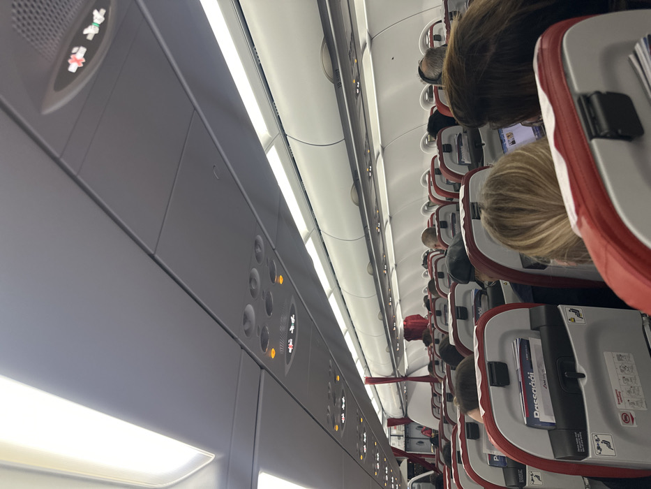 - "The image depicts the interior of a commercial passenger aircraft cabin, viewed from a seated position looking forward down the aisle" by FM-zGYJv1, licensed under CC BY 4.0