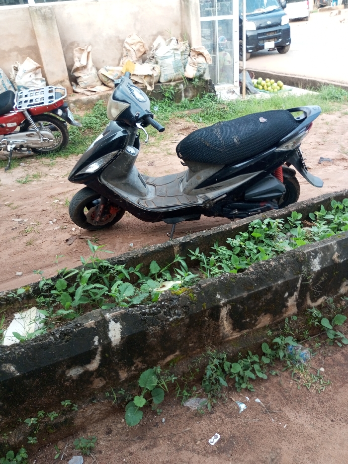 The image displays an outdoor scene in Oko Town, Nigeria. In the mid-ground, a black scooter with a black mesh seat cover is parked on its kickstand on unpaved reddish-brown dirt. A red motorcycle is partially visible behind the scooter on the left. In the foreground, a concrete drainage ditch, heavily overgrown with green vegetation and exhibiting dark stains, traverses the frame. Small pieces of white debris and a blue plastic bottle are visible within and around the ditch. In the background, a light-colored building wall is visible, with several large, light-colored sacks stacked against it. To the right of the sacks, a glass-paneled door or window is present. Further back on the right, a dark-colored minivan or small truck is partially visible on a paved surface, with a pile of green spherical fruits arranged on the ground near its front. No individuals are present.