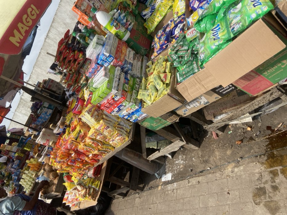 An outdoor market stall, presumed to be in Alasia, Nigeria, is depicted from a slightly elevated, tilted perspective
