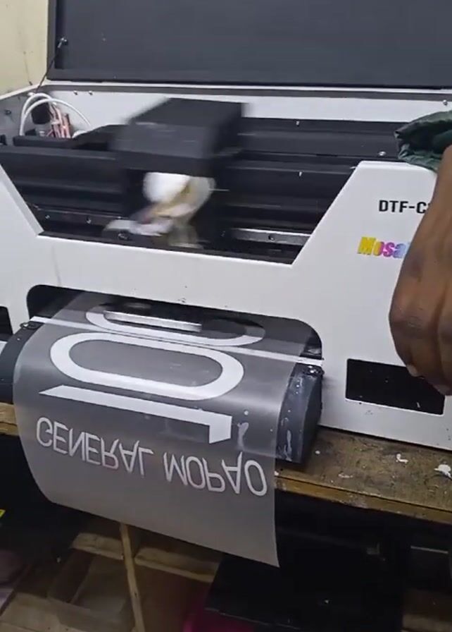A medium shot shows a DTF-C printer in action. The printer is white, with a black interior and a multi-colored logo reading "Mosaic" on the right side. The printer's head moves across the print bed, and a roll of gray material with reversed white text, reading "GENERAL WOBASO," feeds out of the printer. A person's hand is visible on the right side of the frame. The printer is sitting on a wooden table, below which there's a shelf with various items, including a pink bucket.