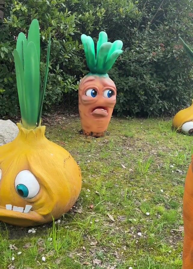 The camera focuses on three cartoonish statues in a grassy, shrubbery-filled area. The statue on the left appears to be an onion, while the statue in the middle is a carrot. Both statues have large, cartoon eyes and mouths, making them look slightly frightened or surprised. The statue on the right is partially visible and also appears to be some kind of vegetable. The scene suggests the statues are part of an outdoor decoration or exhibit.