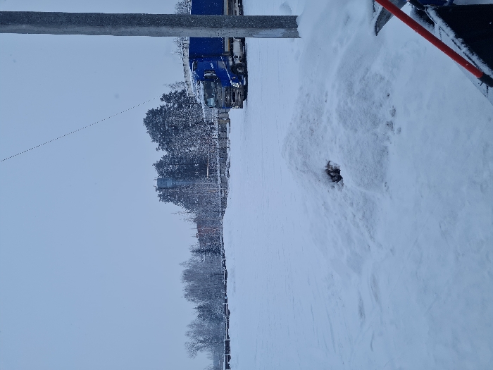 A snowy landscape features a vehicle, possibly a truck, partially visible against a backdrop of trees. The ground is blanketed in snow, with an apparent hole or depression in the snow-covered surface. A red object, potentially a tool or marker, is positioned to the right side, partially obscured by snow. A concrete element extends across the upper portion of the scene.