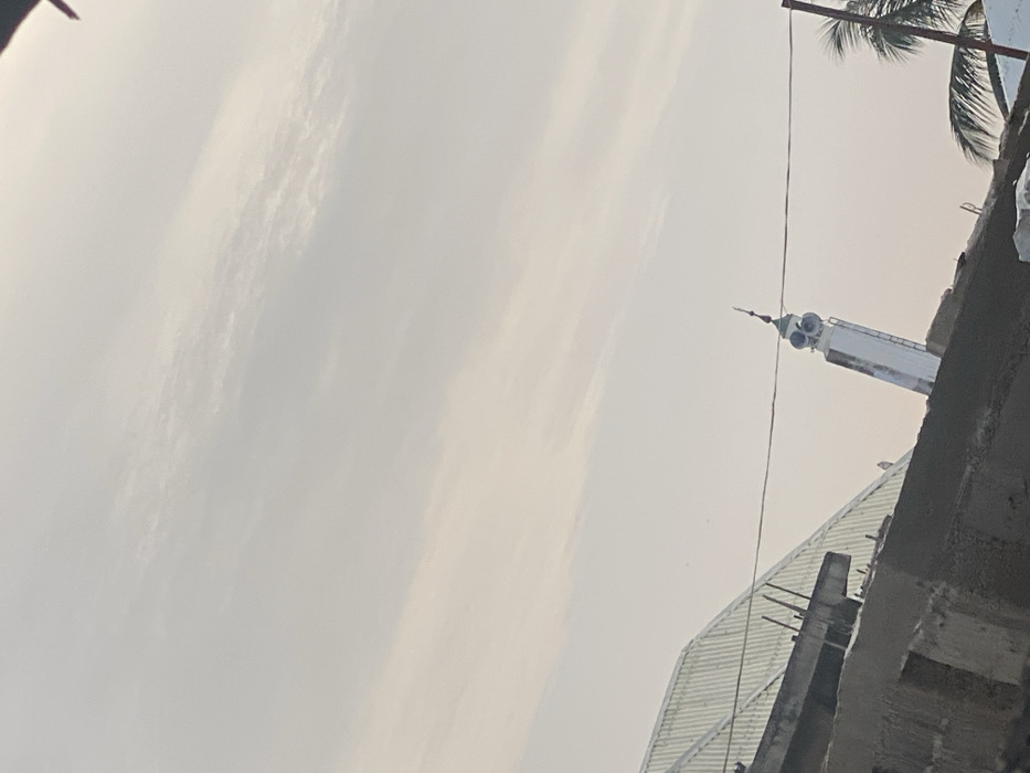 The image depicts an urban or semi-urban landscape in Zango-ndaji, Nigeria, under an overcast sky. The foreground features the dark, irregular top edge of what appears to be a concrete or masonry structure, possibly a rooftop or unfinished wall. To the immediate left, a portion of a building with a light-colored, corrugated metal pitched roof is visible. A thin, dark utility line spans horizontally across the mid-ground. Prominently in the central-right background stands a tall, slender white minaret with a conical top and finial, featuring two circular elements, possibly loudspeakers, near its apex. To the far right, the fronds of a palm tree are partially visible. The sky occupies the upper two-thirds of the frame, displaying uniform light grey cloud cover with subtle texture. No people or active interactions are observed in the scene.