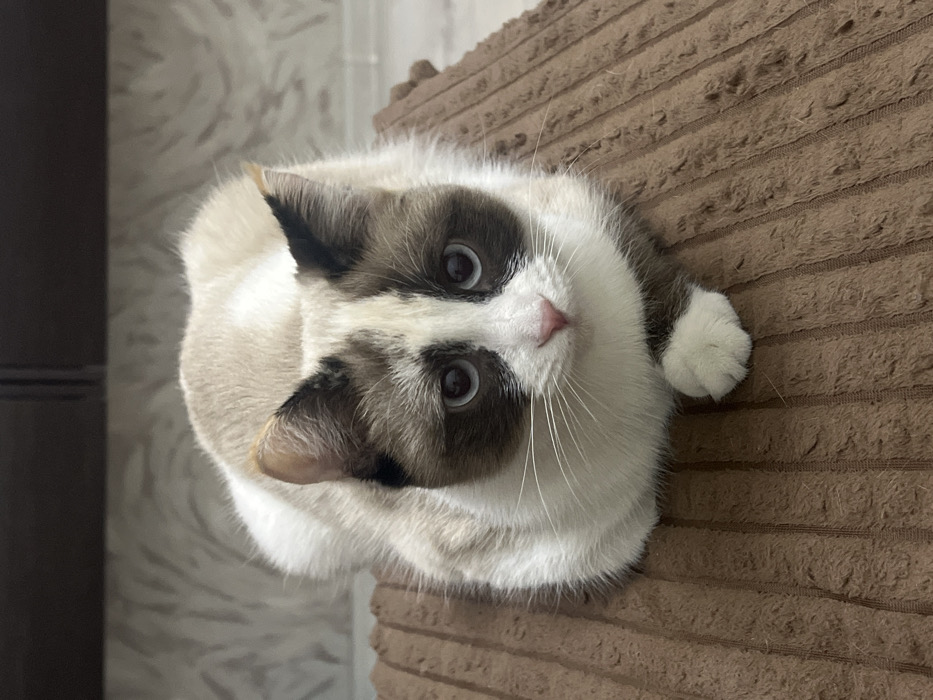 - "A domestic cat, exhibiting creamy white fur with prominent dark brown facial mask, ear, and paw markings, and distinct blue eyes, is depicted resting in a 'loaf' position" by FM-A5lOj2, licensed under CC BY 4.0