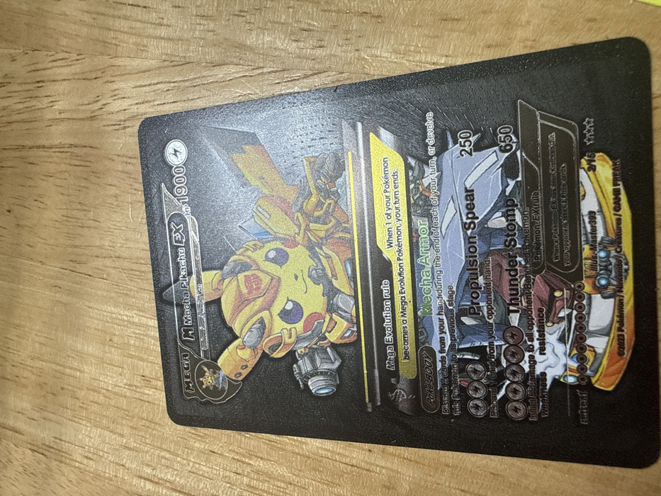 custom, black-bordered Mega Mecha Pikachu EX Pokémon card