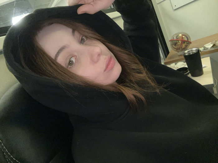 A person with reddish-brown hair wears a black hoodie, pulled up over their head. They are looking at the camera with a slight pout. The person is partially reclined on a dark chair or sofa. A desk or table is in the background with a decorative globe, a black tumbler, and some other items on it. The lighting is muted.