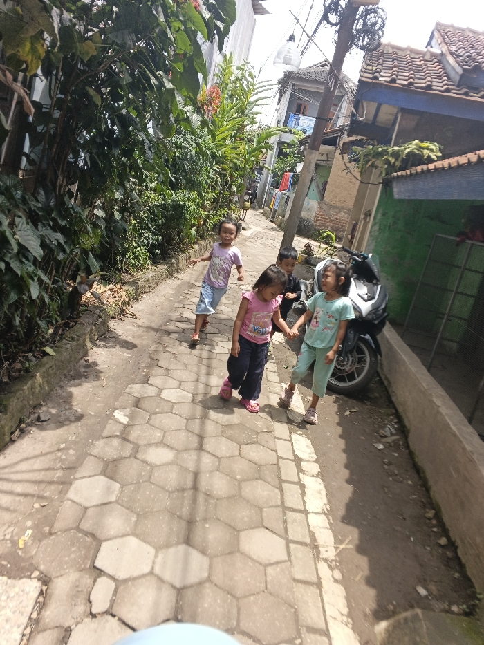 Four children occupy a narrow, sunlit walkway constructed of hexagonal pavers. A young boy leads, running ahead. Two girls hold hands, with a boy behind them. Lush greenery flanks the walkway's left, contrasting with the buildings and a parked motorcycle to the right. The buildings exhibit diverse architectural elements. The image is taken at ground level, showing a blur at the very bottom.