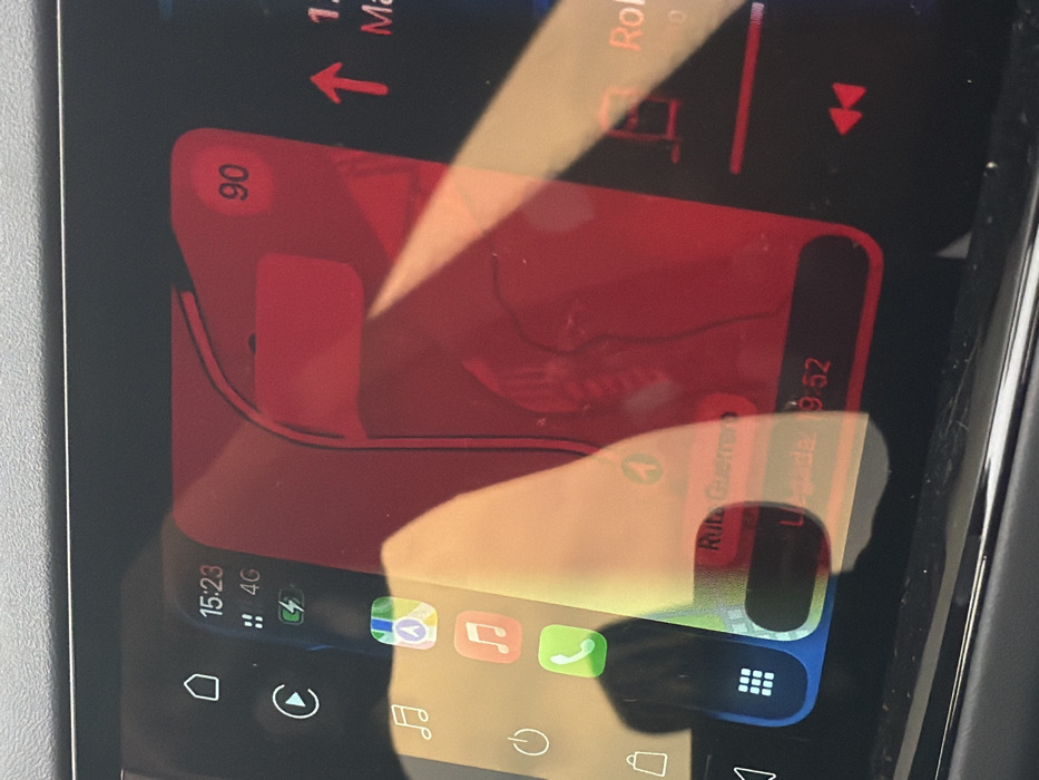 A car's infotainment screen shows a navigation app displaying a route. A "90" speed limit sign is visible. The screen also displays time 15:23 and "4G" network. App icons including Google Maps, music, and phone are at the bottom of the screen, along with a button to access all apps. Navigation instructions are present: "1. Ma" and "Ro". A section of the navigation app indicates "Ruta Guerrero" and "Llegada 19:52".