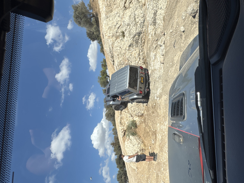 - "The image depicts an off-road scene in Hadid, Israel, captured from the interior of a vehicle looking forward over its silver and dark grey hood, which features a red stripe and functional vents" by FM-49RIN2, licensed under CC BY 4.0